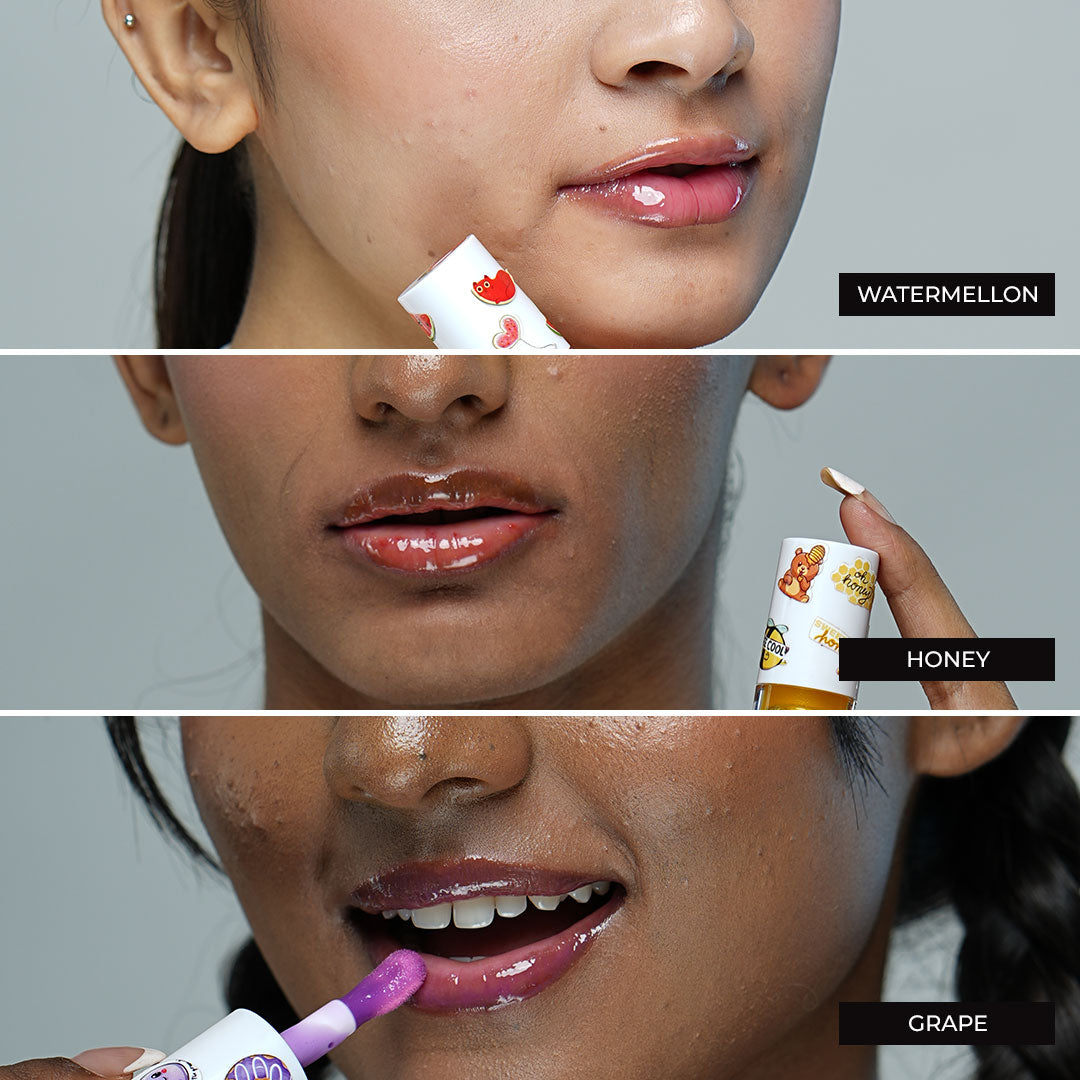 Get honey-bombed! TWICE the juice, with infinite lip care and unreal tints. Itโs Givingโฆ Honey, honey. 2 hydrating lip oils powered with Hyaluronic Acid + Jojoba Oil, for ultimate lip care, and juicy tint for brilliant lip couture. Itโs almost like, your lips are ready for the runway. Whether you want a natural everyday gloss or a glossy lip look that lasts through classes, brunches and selfies, this duo has your back. Non-sticky, super lightweight, and totally pocket-friendly, this combo is your new lip care must-have. Get ready for the glossiest pout ever! And did we mention, it comes with FREE stickers, so you can give it the perfect Pinterest makeover, anytime! โจ๐