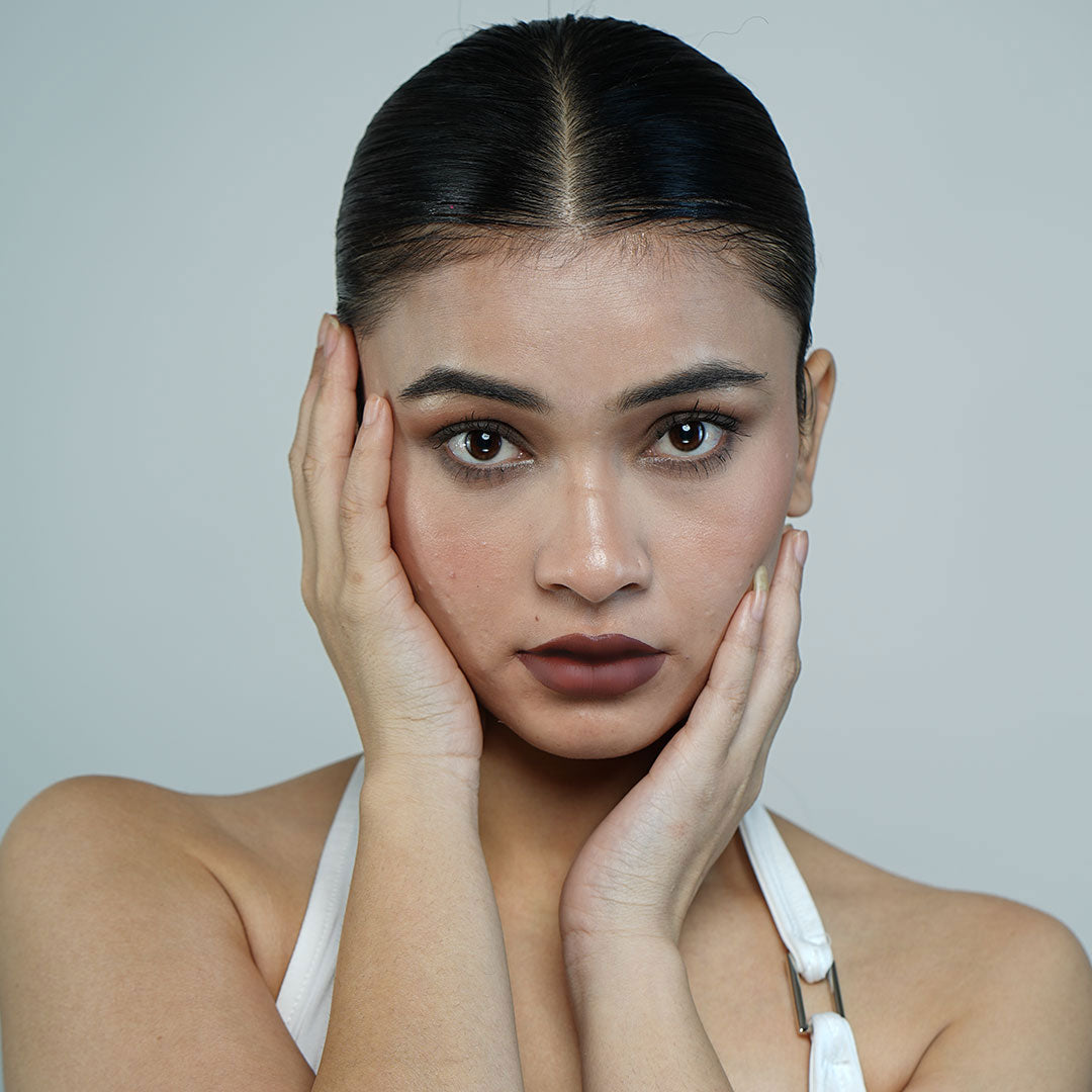 - Apply the Deep Brown Liquid Lipstick for bold, long-lasting color.